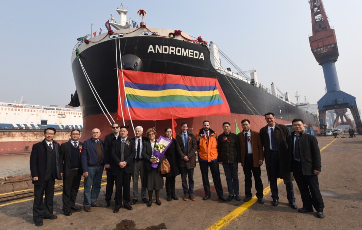 The naming ceremony for No.42 64K BC was held 20 February 2016 Victory report from Chengxi Shipyard at 11:18 a.m. on Feb. 5: the naming ceremony for No.42 64K bulk carrier built for Dalnave was held on the outfitting quay of Chengxi. Present at the ceremony were representatives of owners and classifications, Mr. Rong Yao, Vice General Manager of European Department, CSTC, Mr. Zhou Jianxiang, Vice-President of Chengxi Shipyard and other related leaders and guests. On the ceremony, Mrs. Evangelia Dimaratou, the lady sponsor named the new vessel into “M.V. ANDROMEDA”, and wished a safe journey and a promising future. The valuable experience accumulated from the construction of the great ship will lay a solid foundation to the following newbuilding projects and contribute to further cooperation between both companies. M.V. ANDROMEDA, the No.42 64K bulk carrier built for Dalnave, departed from Chengxi Shipyard at 13: 28 p.m. on Feb.6.