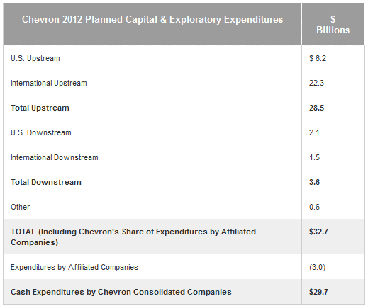 Approximately 87 percent of the 2012 spending program is budgeted for upstream crude oil and natural gas exploration and production projects. Another 11 percent is associated with the company's downstream businesses that manufacture, transport and sell gasoline, diesel fuel and other refined products, fuel and lubricant additives, and petrochemicals. Upstream Spending of $28.5 billion is planned for exploration and production activities, including major natural gas-related projects. Major capital investments include developments in Australia, the deepwater Gulf of Mexico, Nigeria, Angola and China. Planned capital spending is also directed toward improving crude oil and natural gas recovery and reducing natural field declines of existing producing assets throughout the world. "We are building new legacy positions with major investments in LNG projects and the deepwater Gulf of Mexico. Our global LNG investments are estimated to reach peak spending in 2012 and 2013," said Vice Chairman George Kirkland. "In 2014 we expect to begin reaping the benefits of these investments as Gorgon and our deepwater projects ramp up production and begin contributing substantially to cash flow." In Australia, the Gorgon LNG project is entering its third year of construction, with first production scheduled for 2014. The project is approximately one-third complete and has awarded contracts worth over $25 billion. The Wheatstone LNG project was sanctioned in September 2011 and is entering its first year of construction. First production is expected in 2016. The project has already awarded $6 billion in contracts. Once online, these two LNG projects are expected to add approximately 350,000 barrels net oil-equivalent production per day. Production from these LNG plants is expected to be sustained at these same levels for many years. In the Gulf of Mexico, projects under development include Jack/St. Malo, Big Foot, Tahiti-2 and Tubular Bells. Both the Jack/St. Malo and Big Foot projects are approximately 20 percent complete. First production for both projects is expected in 2014. Upstream spending for major capital projects in other regions includes: • Nigeria – development of the Usan and Agbami deepwater fields, and construction of the Escravos gas-to-liquids facility • Angola – Angola LNG and development of Mafumeira Sul • China – development of the Chuandongbei natural gas project • Brazil – development of the Papa-Terra deepwater field • Canada – Hebron offshore development • United Kingdom – development of the offshore Clair Ridge project • Kazakhstan/Russia – Caspian Pipeline expansion Global exploration funding is expected to be $3 billion in 2012. This planned spending includes initial appraisal of new acreage captured over the past two years, including Liberia, China and various international shale gas plays. The program also supports continued exploration and appraisal activity in Chevron's focus areas of Western Australia, the Gulf of Mexico and western Africa. About 30 percent of the Upstream capital program is targeted to support currently-producing assets and mitigate natural field decline. This includes further development of recently-acquired acreage in the Marcellus trend in the northeast U.S., the Wolfcamp play in West Texas and the Pattaini Basin offshore Thailand. Downstream Capital spending of $3.6 billion in 2012 is budgeted for downstream operations. Investments include refinery projects geared toward improving returns by increasing energy efficiency and feedstock flexibility, and producing cleaner fuels. Investments also are targeted toward producing base oils at Pascagoula, Mississippi, and expanding Oronite additives production in Singapore. Additional investments are expected to be funded by Chevron affiliates. These include the continued upgrading of the Yeosu refining complex in South Korea associated with the company's 50 percent-owned GS Caltex affiliate, and additional chemicals projects in the United States and Saudi Arabia associated with the company's 50 percent-owned Chevron Phillips Chemical Company LLC. All Other Expenditures of approximately $600 million in 2012 are budgeted for technology, power generation and other corporate activities. Chevron is one of the world's leading integrated energy companies, with subsidiaries that conduct business worldwide. The company is involved in virtually every facet of the energy industry. Chevron explores for, produces and transports crude oil and natural gas; refines, markets and distributes transportation fuels and lubricants; manufactures and sells petrochemical products; generates power and produces geothermal energy; provides energy efficiency solutions; and develops the energy resources of the future, including biofuels. Chevron is based in San Ramon, Calif. More information about Chevron is available at www.chevron.com. Chevron Corporation press release |