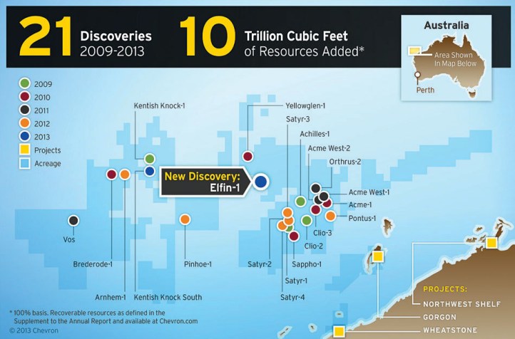 Since mid-2009, Chevron made 21 discoveries offshore western Australia, adding 10 trillion cubic feet of resources. (Graphic: Business Wire) Chevron is one of the world’s leading integrated energy companies, with subsidiaries that conduct business worldwide. The company is involved in virtually every facet of the energy industry. Chevron explores for, produces and transports crude oil and natural gas; refines, markets and distributes transportation fuels and lubricants; manufactures and sells petrochemical products; generates power and produces geothermal energy; provides energy efficiency solutions; and develops the energy resources of the future, including biofuels. Chevron is based in San Ramon, Calif. More information about Chevron is available at www.chevron.com. Chevron Corporation press release |