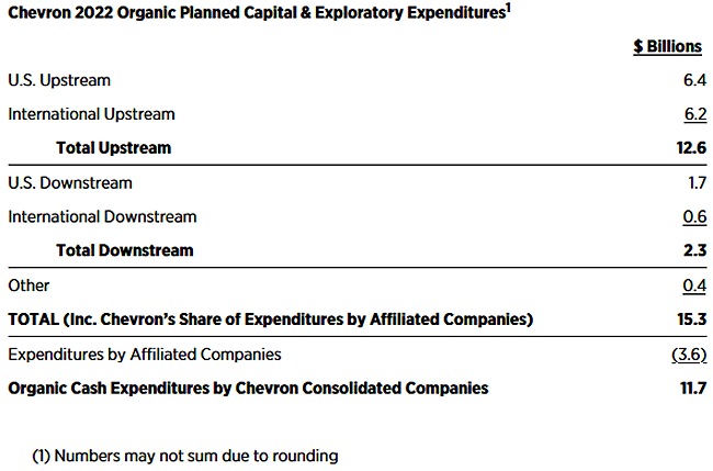 Downstream Approximately $2.3 billion of planned organic capital spending is associated with the company’s downstream businesses that refine, market and transport fuels, and manufacture and distribute lubricants, additives, and petrochemicals. This also includes capital to grow renewable fuels and products businesses. Chevron is one of the world’s leading integrated energy companies. We believe affordable, reliable and ever-cleaner energy is essential to achieving a more prosperous and sustainable world. Chevron produces crude oil and natural gas; manufactures transportation fuels, lubricants, petrochemicals and additives; and develops technologies that enhance our business and the industry. We are focused on lowering the carbon intensity in our operations and seeking to grow lower carbon businesses along with our traditional business lines. More information about Chevron is available at www.chevron.com. Chevron Corporation press release