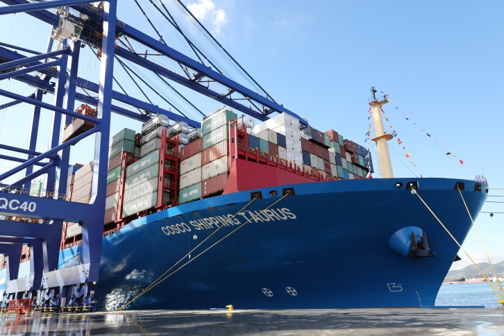 In November 2008, COSCO SHIPPING Ports won the international bid for the concession of PCT. Piraeus Container Terminal SA, its wholly-owned subsidiary, took over the No. 2 pier of PCT on June 1, 2010, followed by the construction of the No. 3 pier by reclaiming land from the ocean (partly under construction). The berth put into use this time lies in the No. 3 pier. According to the plan, upon completion in early 2019, the No. 3 pier will cover an area of 340,000 square meters, featuring four berths with a water depth of more than 18.5 meters and a coastal line of nearly 1,400 meters. It will be fitted with 13 double girder bridge cranes, 6 rail-mounted gantry cranes and 24 electric tyre cranes with a designed annual throughput of 3 million TEU. Coupled with that of the No. 2 pier, PCT’s annual throughput will hit 6.2 million TEU then. Taken into account the No. 1 pier managed by the Piraeus Port Authority (PPA), Piraeus will own five berths able to accommodate containerships with a capacity of over 10,000 TEU, and see an annual throughput of 7.2 million TEU, ranking No. 1 in the Mediterranean in terms of port facilities. From 2010 to 2016, Piraeus’ container throughput more than quadrupled from 880,000 TEU to 3.74 million TEU, a drastic ranking rise from the 93rd place the 38th place among container terminals all over the world. In 2017, Piraeus’ container throughput was expected to move up in the ranking as its throughput hit a record high of 4 million TEU. In addition, PCT made efforts to optimize its operation process and became the most efficient terminal in the Mediterranean in 2017. COSCO SHIPPING TAURUS is the second 20,000 TEU+ ultra-large containership operated by COSCO SHIPPING, with an LOA of 400 meters, molded beam of 58.6 meters, maximum draft of 16 meters, design speed of 22.5 knots/hour, maximum deadweight of 200,000 tons and maximum load of 20,119 TEU. Fitted with 1,000 reefer plugs, it was classed by both DNV-GL and China Classification Society (CCS). With Shanghai as the port of departure ,COSCO SHIPPING TAURUS called at the port of Piraeus (Greece), Rotterdam (the Netherlands) ,Hamburg (Germany), offering rapid and trusted direct shipping service from North China, East China and Southeast Asia to Greece and major northwestern European countries. China COSCO Shipping Corp. Ltd. press release |