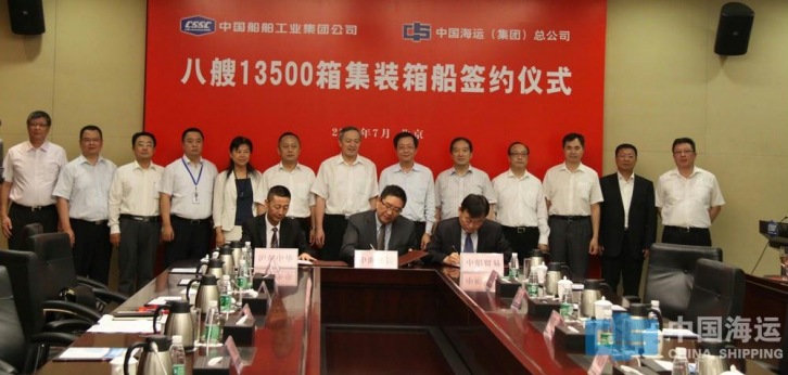 August 2015 On July 29th, CSCL and Hudong-Zhonghua signed a ship building contract of eight 13500TEU container ships. CSCL president Zhao Hongzhou, Hudong-Zhonghua managing VP Huang Yiping and China Shipbuilding Trading Company president Li Hongtao signed on the contract on behalf of the three. China Shipping chairman Xu Lirong, vice president Ding Nong, CSSC Chairman Dong Qiang, vice president Nan Daqing attended the signing ceremony. The eight 13500TEU container ships have great function in terms of technique, towage and energy conservation. The series will optimize China Shipping’s container fleet structure and enhance the competitiveness of the fleet.