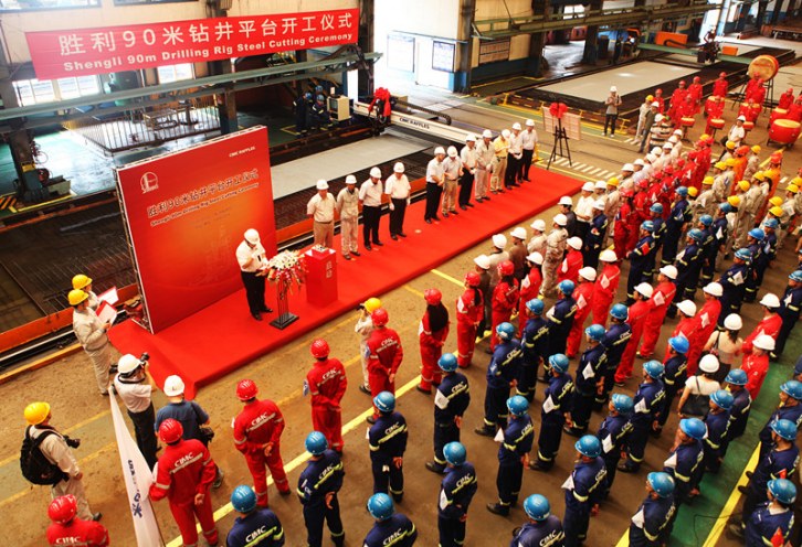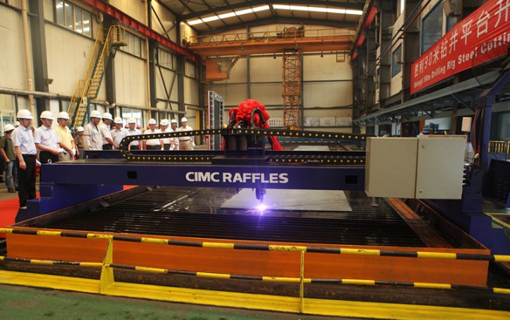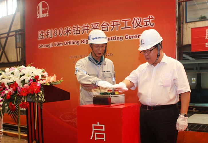 16 July 2015 On 16th July 2015, the 90-meter jackup built by CIMC Raffles for Sinopec cut its first steel in CIMC Raffles Yantai shipyard. The basic design is completed by Sinopec Drilling Technology Research Institute while CIMC Raffles is responsible for detailed design, producing design and construction. With operating depth of 91.4 meters, drilling depth of 9,144 meters and amenities for 120 persons, the jackup can be operated in 15 to 91.4 meter sea areas worldwide and is classed by CCS. It is the second large offshore drilling rig project since CIMC Raffles signed strategy cooperation agreement with Sinopec in 2012. “New Shengli #1”, the first jackup, takes 363 days since starting to drilling operation. With 22 wells completion and drilling of 45,279 meters, it becomes the star of Shengli offshore drillings. It is the 17th jackup build by CIMC Raffles. CIMC Raffles has delivered 10 jackups, operating in Bohai Bay, Persian Gulf and Caspian Sea.