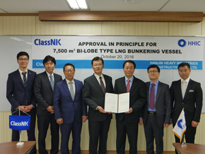 Busan – 20 October, 2016 Leading classification society ClassNK has issued Approval in Principle (AIP) for a 7,500 cbm LNG bunkering vessel designed by Hanjin Heavy Industries & Construction Co., Ltd. This revolutionary design is the result of joint research carried out by Hanjin Heavy Industries & Construction Co., Ltd. and ClassNK to improve the efficiency of LNG bunkering vessels. The choice of LNG as ship fuel has become increasingly prevalent in the industry, and is expected to become one of a primary source of fuel in the near future. However, LNG fueled vessels are currently largely dependent on existing infrastructure comprised mainly of fixed bunker locations, potentially limiting their operations. Recognizing the greater flexibility that LNG bunker vessels could provide through ship-to-ship bunkering, Hanjin Heavy Industries & Construction Co., Ltd. and ClassNK worked together to improve the viability of this technology. The innovative design employs type-C bi-lobe tanks, improving on cargo capacity to allow for greater efficiency and productivity. The AIP was granted after confirming the design complies with ClassNK’s Rules and Guidance for the Survey and Construction of Steel Ships. This AIP allows the design to be considered for further individual projects, where tests on the hull structure scantling and direct stress analyses will be carried out to ensure the structural integrity of each specific design is in line with class rules and the International Code for the construction and equipment of ships carrying liquefied gases in bulk (IGC Code). Speaking on the occasion, Takashi Nishibashi, ClassNK’s Country Manager of Korea said: “Hanjin Heavy Industries & Construction Co., Ltd. and ClassNK have always enjoyed close cooperation, and this design is just one of the fruits of our relationship. We hope this AIP will help pave the way for a new generation of highly efficient LNG bunkering vessels.” Cha-Soo Lee, Technical Director of Hanjin Heavy Industries & Construction Co., Ltd. added: “When we are commissioned to develop an LNG bunkering vessel concept by clients we face a much wider array of challenges, such as compact ship’s dimensions, robust hull structure, more cargo capacity, simple operation and lower ship’s price etc. We are happy to find the best compromise between economic and technical issues through this joint research with ClassNK.” ClassNK press release |
