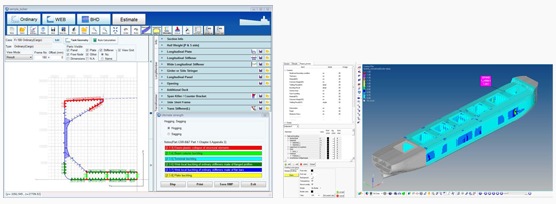 Left Prescriptive rule calculation software: Initial design function/ ultimate strength evaluation results Right Direct strength assessment software: Comprehensive analyses with whole ship FE models ClassNK press release |
