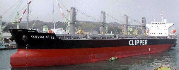 The 38,000 dwt Clipper Bliss. Image by Clipper Group CLIPPER BLISS BUILT: 2014 DWAT: 38,243 DRAFT: 10.54 LOA: 179.97 FLAG: Panama BEAM: 29.8 GRAIN CUBIC: 1,664,136 cubic feet HOLDS/HATCHES: 5/5 CRANES: 4 x 30 mt SPEED/CONS (laden): abt 14 kts on abt 27.6 mt IFO NDAS Clipper Group - Press Release |