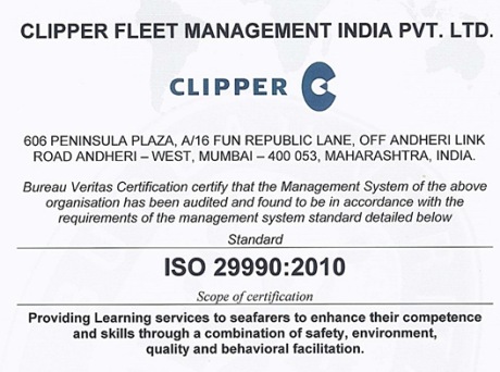 Clipper Fleet Management in India has been ISO 29990 certified as Learning Services Provider by Bureau Veritas. The certificate stands for ‘providing learning services to seafarers to enhance their competence and skills through a combination of safety, environment, quality and behavioral facilitation.'
