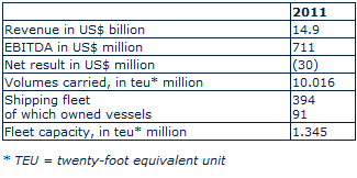 The Group reported revenue of US$14.87 billion for the year, a 4% increase on 2010. Volumes carried increased by 11%, outperforming the market’s 6.5% increase and reaching a record high of 10,016,000 teus. The market environment was challenging, shaped by overcapacity and the steep run-up in oil prices, with per-tonne bunker prices soaring 34% over the year. CMA CGM nevertheless enjoyed a satisfactory operating performance, thanks to its extremely efficient fleet, global network and sustained cost discipline. EBITDA stood at US$711 million, down from 2010, year in which the entire container shipping industry reported record profits. The Group ended the year with a consolidated net loss of US$30 million. CMA CGM continued to assertively dispose of non-strategic assets during the year. It also strengthened its balance sheet by issuing US$500 million in ORA equity notes to the Yildirim Group and raising an aggregate US$945 million through two bond issues denominated in dollars and euros. Outlook for 2012 Although the beginning of the year was difficult for the entire industry, freight rates are now trending upwards, especially outbound Asia. Several shippers, including CMA CGM, have announced and are introducing significant rate increases as from the 1st of March 2012. In addition, to enhance its operating performance, the Group plans to: • Continue implementing operating partnerships with MSC on the Asia/North Europe and South America lines and with Maersk on the Asia/Mediterranean, Adriatic and Black Sea trades. • Deploy increasingly efficient, modern and cost-effective vessels on every trade. • Develop more innovative, high-quality information technology services thanks to the new strategic partnership with IBM. CMA CGM is pursuing its cost reduction plan, which is expected to deliver US$400 million in savings this year. In the same way, the decline in charter rates will reduce operating costs by US$80 million in 2012. Thanks to all these measures, the Group expects to report a profit in 2012, in a market that is difficult to predict given the scheduled arrival of a large number of new vessels and further increases in bunker costs. In that context, on 6 March, CMA CGM met with its banks to discuss the market volatile situation and its consequences. The Group remains confident in the future of the industry and will continue to strengthen its positions, particularly in Russia, India, Latin America and Africa, as well as in the reefer segment. Commenting on the results, Rodolphe Saadé, CMA CGM Group Executive Officer, said: “Once again this year, CMA CGM has demonstrated its strong resilience at a time of intense turmoil in our industry. Our operating and financial performances were among the best in the industry. We set up strategic operating partnerships with MSC and with Maersk to address market challenges and maintained our commitment to controlling costs. We expect the market to improve in 2012, particularly in the second half. With its modern, efficient fleet and its skilled, experienced teams, CMA CGM is well positioned to capture all of the benefits.” Financial Highlights as of 31 December 2011