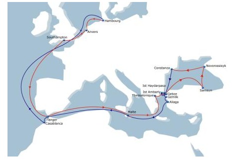 Hamburg Antwerp Southampton Tangiers Malta Thessaloniki Gebze Ambarli Haydarpasa Samsun Novorossiysk Constanta Ambarli Gebze Gemlik Aliaga Malta Tangiers Casablanca
