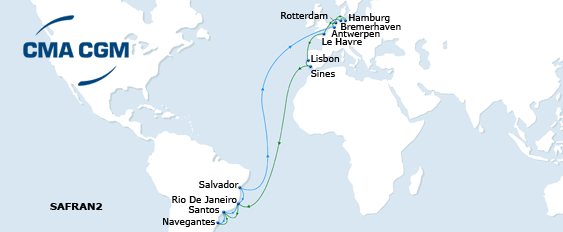 SAFRAN 2 will be operated with 7 x 5700 TEU vessels with the following rotation: ANTWERP – ROTTERDAM – HAMBURG - BREMERHAVEN - LE HAVRE – LISBON – SINES - RIO DE JANEIRO SANTOS – NAVEGANTES – SANTOS - RIO DE JANEIRO – SALVADOR - ANTWERP