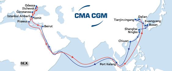 Image by CMA CGM Operated on one of the emblematic lines of the Group, the « Bosphorus Express », (BEX), the CMA CGM VOLGA will offer direct service between Asia, Turkey and the Black Sea. Accordingly, it will call Dalian, Tianjin, Kwangyang, Busan, Shanghai, Ningbo, Chiwan, Yantian, Tanjung Pelepas, Izmit, Istambul Ambarli, Constanza, Odessa, Ilyichevsk, Port Said, Port Kelang, Singapore, and once again Dalian.