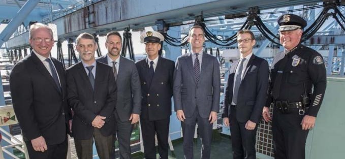 From left to right: PoLa Executive Director Gene Seroka, CMA CGM Operations Patrice Mittard, Los Angeles Council Member Joe Buscaino, Master of the CMA CG BENJAMIN FRANKLIN Captain Krpan, Los Angeles Mayor Eric Garcetti, CMA CGM America LLC President Marc Bourdon and Los Angeles Port Police Chief Thomas Gazsi (Copyright: Port of Los Angeles) Unprecedented measures for this “Giant of the Seas”