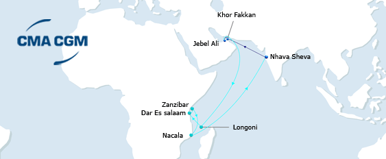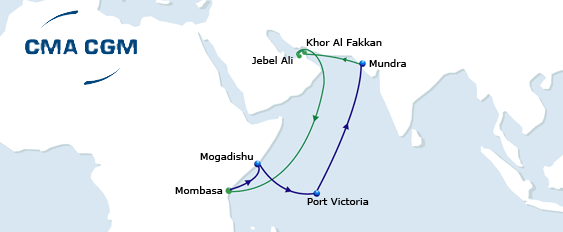 Thursday, July 07, 2016 In a continued effort to provide increased reliability and quality services in a challenging environment, CMA CGM will reorganize its services connecting India Middle East Gulf to East Africa strategic markets. Starting mid July 2016, NOURA EXPRESS and SWAHILI services new configuration will provide significant improvements: • Positive developments for reefer cargo from Port Victoria direct to India and to Europe with a weekly frequency instead of fortnightly • Improved service reliability to Mogadishu from Mundra with direct service in 18 days instead of in transhipment, very fast transit time from Jebel Ali to Port Victoria in 18 days. NOURA EXPRESS service operated with 4 vessels of 2,200 TEU will stop Salalah call and add in its port coverage Mundra and Port Victoria. Effective m/v MARIE DELMAS voy. 1339WS Mundra ETA July 24th, 2016, and as from m/v CMA CGM LATOUR voy. 1299WS Port Victoria on July 31st, 2016. NOURA EXPRESS service new port coverage will be the following: Mundra - Khor Fakkan - Jebel Ali - Mombasa - Mogadishu - Port Victoria - Mundra