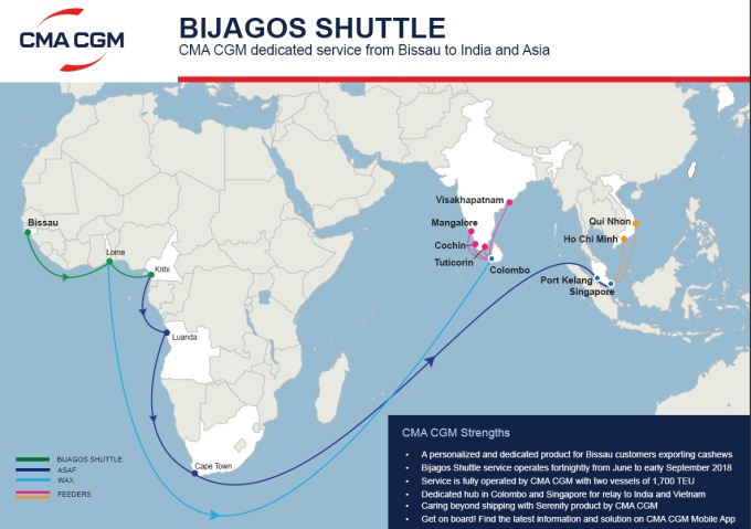 BIJAGOS SHUTTLE: Seasonal service from Bissau May 24, 2018 In addition to its broaden coverage of 31 services in Sub-Saharan Africa, CMA CGM is pleased to resume the Bijagos Shuttle service, the personalized and unique product well-known in Bissau market to serve cashew exports. Starting June 1st, 2018, Bijagos Shuttle service fully operated by CMA CGM deploys two vessels of 1,700 TEU nominal capacity. Bissau port is served on fortnightly frequency during the cashew season from June 2018 to early September 2018. The highest service standards on Bijagos Shuttle service will enable CMA CGM to offer an efficient and reliable service to Bissau Exporters. Indian ports will be reached in 40 days via Lome and Vietnam ports in 47 days via Kribi, our strategic hub in West Africa.