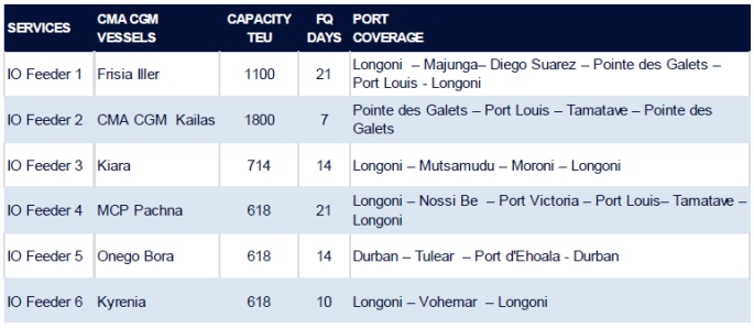 CMA CGM to upgrade its Indian Ocean Feeder Network June 11, 2018 With the recent phase-in of a larger capacity vessel up to 1,800 TEU on the Indian Ocean Feeder 2, CMA CGM would like to share with you the new complete set up of our Indian Ocean Feeder network with the introduction of a 6th loop Indian Ocean Feeder. To support the positive commercial exchanges in the dynamic Indian Ocean market and Intra Africa with more space and increased reliability of our product in the region, we are glad to announce effective mid-June 2018: • Majunga and Diego Suarez ports on IO Feeder 1 will benefit of increased capacity • Upsize of IO Feeder 2 with a vessel of 1,800 TEU, more space in Tamatave and Port Louis • Improved frequency in Diego Suarez and Nossi Be with a call every 21 days on IO Feeder 4 • IO Feeder 6, new dedicated shuttle serving Vohemar with every 10-day frequency • Intra Indian Ocean extended with a new link Tamatave > Longoni