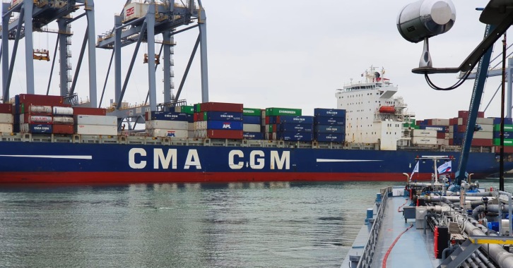 Container ship "White Shark". Image by CMA CGM. Facts and Figures • All GoodFuels sustainable marine biofuels are functionally equivalent to petroleum-derived marine fuels - so called “drop-in” fuels. • No modification is required to the engine or the fuel infrastructure. • All GoodFuels sustainable marine fuels meet the most stringent sustainability criteria, based on the Roundtable of Sustainable Biomaterials (RSB.org) and verified by GoodFuels’ independent sustainability board. This sustainability board consists of leading NGOs and academics. • GoodFuels’ sustainable marine fuels are 100% based on waste and residues. • In this landmark refueling, the bio-fuel oil consists of waste used cooking oil and forest residues - both of which have been sourced and processed in Europe. • The industrial waste stream from food production is used cooking oil which, after processing, is unfit to use for human or animal consumption. The only viable usage for this waste product is for reprocessing into advanced biofuel. • Forest residues are industrial waste streams from paper and pulp production. GoodFuels exclusively sources the forest residues in its fuels from sustainable forests in Europe. Most wood waste streams are currently used to co-fire power plants, and upgrading this waste into advanced low carbon marine biofuels, replacing heavy fuel oil, is considered a more sustainable and economical use of the waste product. • All GoodFuels sustainable marine fuels are virtually SOx free and deliver 80-90% well-to-propeller CO2 reduction versus fossil equivalents. CMA CGM press release |