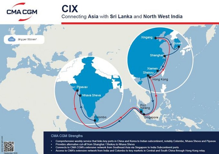 CMA CGM enhances CIX service September 09, 2020 CMA CGM is pleased to announce that it will be enhancing its existing China India Express (CIX) service that connects Asia with the Indian Subcontinent region. The CIX enhancement will see Xingang and Pusan being added as its ports of call, making CIX a comprehensive weekly service that links key ports in China and Korea to Colombo, Nhava sheva and Pipavav. Via the trans-shipment hub of Hong Kong, shipments onboard CIX will be able to gain access to important markets situated in Central and South China through the shipping network of CNC and the CMA CGM Group. The enhanced CIX, complemented by the existing Asia Subcontinent Express (AS1) and Asia Subcontinent Express 6 (AS6) services, forms part of CMA CGM's portfolio of Asia-Indian subcontinent services.