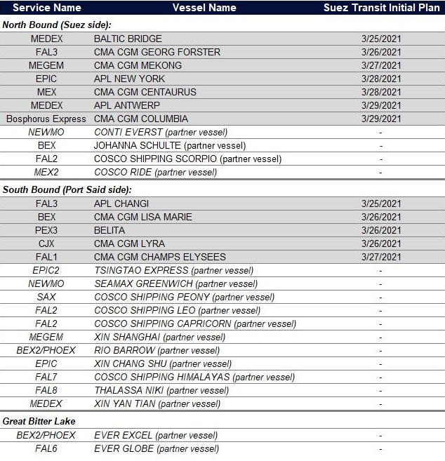 Please do not hesitate to contact your usual CMA CGM commercial representative should you have any further question. Situation in Suez Canal #6 April 01, 2021 Dear valued Customers, The CMA CGM Group is glad to inform its customers that Suez Canal transit improves, we continue doing our utmost to minimize the impact on vessel schedules and your supply chain. As of today, we will be able to resume equipment release for a great part of our vessels previously on hold. Please find hereafter our latest situation update: