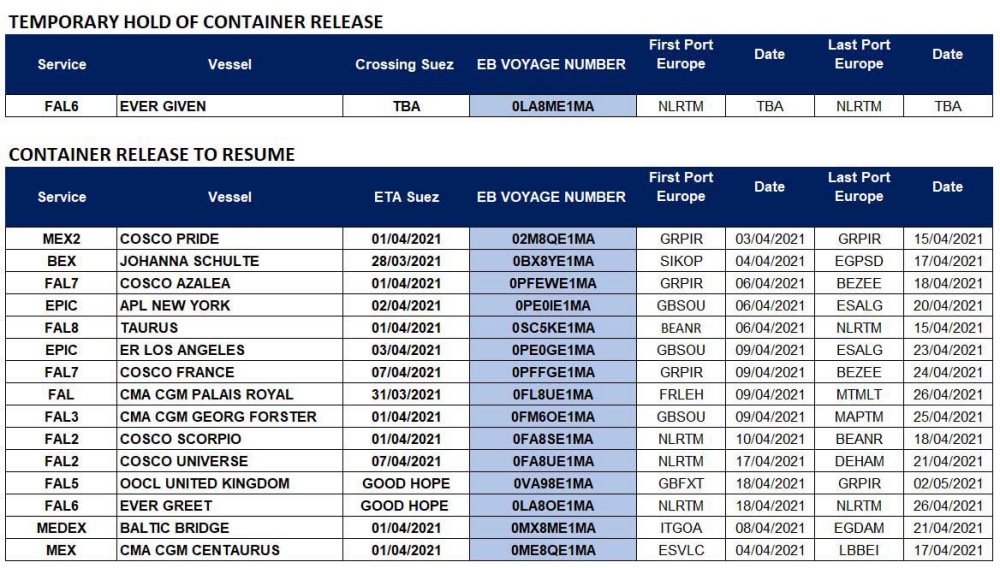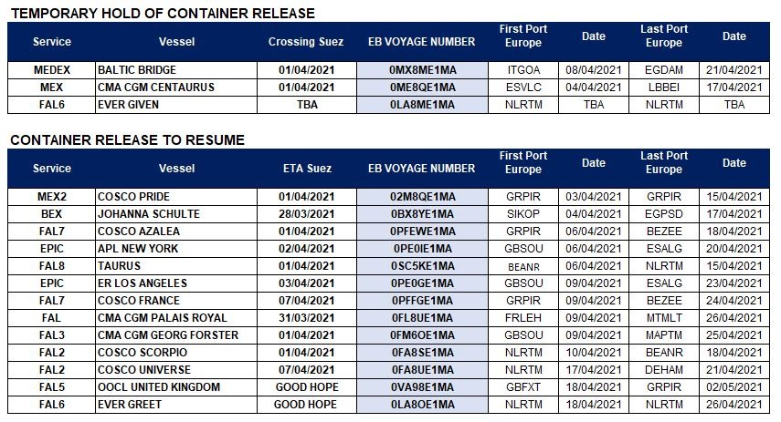 April 02, 2021 Dear valued Customers, The CMA CGM Group is glad to inform its customers that Suez Canal transit improves, we continue doing our utmost to minimize the impact on vessel schedules and your supply chain. Equipment release has now resumed for almost all our vessels previously on hold. Please find hereafter our latest situation update: