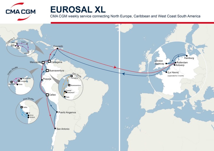 CMA CGM to temporarily reshuffle EUROSAL service connecting North Europe with West Coast South America & the Caribbean June 28, 2021 CMA CGM informs its customers that heavy congestion and lack of productivity have been experienced for months in North Europe, affecting schedule reliability of its EUROSAL service connecting North Europe with West Coast South America & the Caribbean. Unfortunately, this situation is not expected to improve with the summer period. Therefore, to maintain the quality of service in this difficult environment, EUROSAL service will suspend its Le Havre call for a period of 3 months as from m/v "CMA CGM JEAN GABRIEL" ETA Rotterdam on July 6th, 2021. During these 3 months, rotation will be as follows: Rotterdam, London Gateway, Hamburg, Antwerp, Caucedo, Cartagena, Manzanillo, Buenaventura, Posorja, Callao, Puerto Angamos, San Antonio, Callao, Posorja, Manzanillo, Cartagena, Caucedo, Rotterdam Coverage of Le Havre import/export will be offered in transhipment in Antwerp.