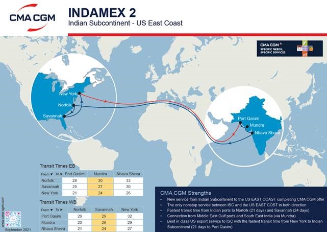 September 14, 2021 CMA CGM is pleased to announce the launch of the INDAMEX 2, a complementary service to the current INDAMEX, offering optimized connections to/from the INDIAN SUBCONTINENT and the US EAST COAST. With this new loop, CMA CGM strengthens its service offer on the trade in order to match customers' strong demand. 8 vessels will be deployed (3 of them operated by CMA CGM), providing the only nonstop service between ISC and US EAST COAST in both directions. Service will start at the end of October to support the traditional extra demand of our customers during the pre-Diwali period. INDAMEX 2 main features will be the following: • Frequency: Weekly • Rotation: 8 vessels (56 days) | Port Qasim - Mundra - Nhava Sheva - Suez - Norfolk - Savannah - New York • Transit time WB: Nhava Sheva to Norfolk: 21 days | New York to Port Qasim: 21 days • First sailing WB: ETD 25/10 Port Qasim • First sailing EB: ETD 21/11 New York