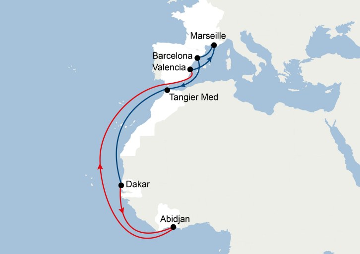 Abidjan will be served from Valencia in 19 days, Marseille in 18 days, Barcelona in 16 days and Tangier Med in 13 days. Our Valencia, Tangier and Marseille hubs will ensure smooth connections to Asia, the Indian Subcontinent & Midlle East Gulf, and the Mediterranean. Efficient intermodal solutions are proposed from/to inland destinations in France, Spain and West Africa. CMA CGM press release
