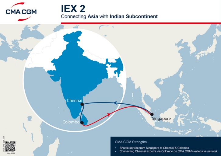 April 29, 2022 CMA CGM is pleased to announce that we will be launching a new India East Coast Express 2 (IEX 2) service that connects Asia with Indian Subcontinent, effective m/v "Songa Tiger" ETD Singapore on May 30th, 2022." IEX 2 features are the following: • Shuttle service from Singapore to Chennai and Colombo • Port Rotation: Singapore - Chennai - Colombo - Singapore • Connecting Chennai exports via Colombo on CMA CGM's extensive network