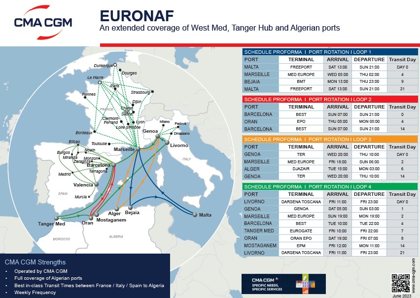 June 27, 2023 CMA CGM is pleased to announce the revamping of its EURONAF service which will now combine 4 loops instead of 2. Thanks to these 4 loops, CMA CGM will offer: • Expanded connectivity with our service network • Optimized service regularity and schedule reliability • Extensive port coverage in West Med • Better service frequency, with 4 departures per week