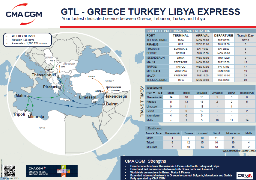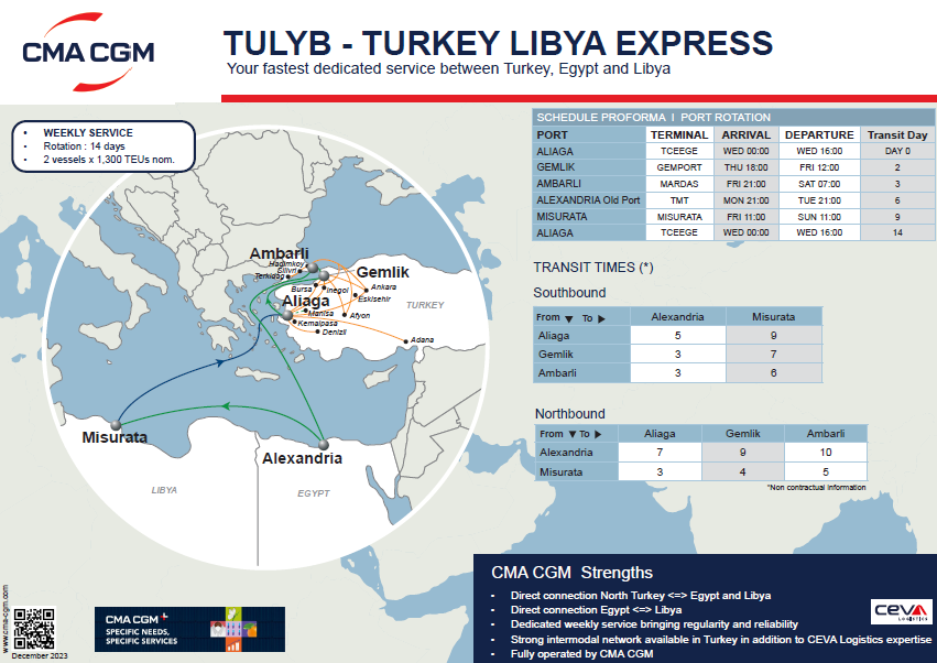 3 January 2024 As there are always BETTER WAYS to address Intramed market, CMA CGM - Short Sea Lines Division is pleased to announce the reshuffling of our TULYB and GTL services as from WEEK 2&3 between TURKEY | GREECE | CYPRUS | LEBANON | MALTA | LIBYA. New TULYB set up will address the North Turkey - Egypt - Libya markets with very fast and direct connections New GTL set up will address the Greece- Cyprus - Lebanon - South Turkey - Libya markets These revised weekly services (starting ex Aliaga on January 10th, 2024 and ex Thessaloniki on January 8th, 2024) will enable to maintain sustainable maritime bridges in the whole East Med region and Libya and will offer worldwide connections in our regional hubs of Beirut, Alexandria and Malta. TULYB main features will be the following: - Fleet: 2 vessels x 1,300 TEU nom. - Rotation: ALIAGA - GEMLIK - AMBARLI - ALEXANDRIA Old port - MISURATA - ALIAGA - Frequency: WEEKLY - Starting: ETA ALIAGA 17/01/24 - Transit times: Ambarli-Misurata in 6 days - Ambarli-Alexandria in 3 days - Gemlik-Misurata in 7 days