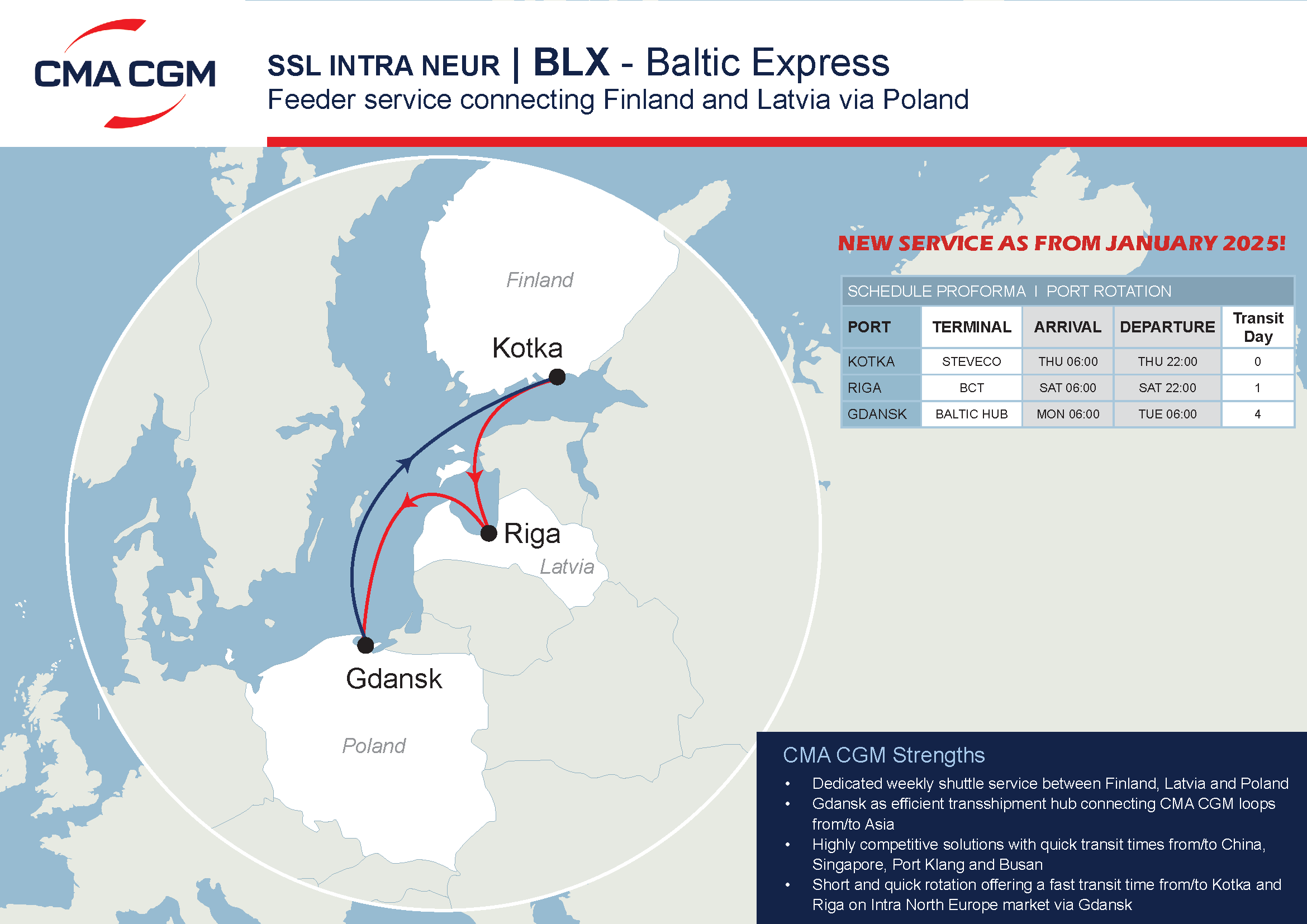 24 Jan 2025 We are thrilled to announce the launch of our new feeder service Baltic Express, effective from Week 4. This new service is expected to provide you with valuable and efficient shipping solutions, by connecting Finland and Latvia via Gdansk. Service Strengths include: • Frequency & Reliability Boosted: Dedicated weekly shuttle between Finland, Latvia and Poland • Efficient Transshipment: Gdansk as efficient transshipment hub connecting CMA CGM loops from/to Asia, as well as from/to Kotka and Riga to Intra-European market • Competitive Solutions: Benefit from quick transit times from/to China, Singapore, Port Klang and Busan BLX first voyage started in Gdansk on January 20th, 2025 with m/v "JSP MISTRAL". Next expected departure dates will be the following: • Gdansk: January 27th, 2025 - Voy. 0C80NE1MA • Kotka: January 30th, 2025 - Voy. 0C80OW1MA • Riga: February 1st, 2025 - Voy. 0C80OW1MA
