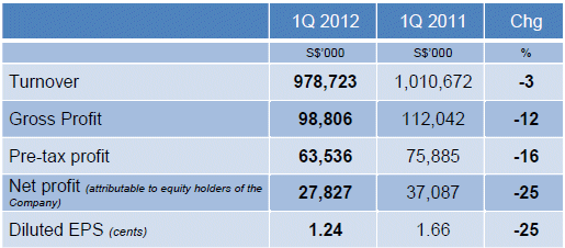 Highlights: • Group achieved net profit attributable to equity holders of $27.8m on turnover of $978.7m against the backdrop of a difficult business environment in Q1 2012. • Group turnover fell 3.2% on declines in shipyard and dry bulk shipping revenues. • Turnover from shipyard operations decreased 2.5% to $965.9m due mainly to lower revenue contributions from ship repair and ship building projects. • Turnover from dry bulk shipping and other businesses dropped 37.6% to $12.8m due to lower charter-hire rates. • Net profit attributable to equity holders of the Company slipped 25.0% to $27.8m on lower profit contributions from dry bulk shipping and shipyard operations. • The Group will continue to focus on reinforcing its strong foundation in ship building and offshore marine engineering sectors, and efficient deliveries and yard upgrades. SINGAPORE (8 May 2012) – Singapore Exchange (“SGX”) mainboard-listed COSCO Corporation (Singapore) Limited (“COSCO” or the “Company”), a leading ship repair & marine engineering and shipping group, today announced its 1st quarter financial results for the 3 months ended 31 March 2012. Group turnover fell 3.2% to $978.7 million in Q1 2012 from $1.0 billion in Q1 2011 due to declines in shipyard and dry bulk shipping revenues. In spite of the growth in revenue from marine engineering segments, turnover from shipyard operations decreased 2.5% to $965.9 million in Q1 2012 from $990.2 million in Q1 2011 due mainly to lower revenue contributions from ship repair and ship building segments. In the quarter, the Group successfully delivered 12 dry bulk carriers and 2 offshore marine engineering vessels – the Sevan Brasil (a cylindrical drilling unit) and a shuttle tanker. Turnover from dry bulk shipping and other businesses decreased 37.6% to $12.8 million in Q1 2012 from $20.5 million in Q1 2011 due to lower charter rates. Gross profit dropped 11.8% from $112.0 million in Q1 2011 to $98.8 million in Q1 2012 mainly due to lower dry bulk shipping income as a result of lower BDI and lower shipyard revenue. Distribution costs rose 13.3% in line with new orders secured and more marketing promotions. As a result, net profit attributable to equity holders of the Company fell 25.0% from $37.1 million in Q1 2011 to $27.8 million in Q1 2012. Capt. Wu Zi Heng, Vice Chairman and President of the Company said, “Our Group expects business and operating conditions for the rest of 2012 to remain difficult and challenging due to the uncertain global economy. We will continue to focus on deliveries while we upgrade our shipyard capabilities and manpower skills to reinforce the strong foundation we have established in the ship building and offshore marine engineering sectors.” As at 31 March 2012, the Group’s order book stood at US$5.8 billion with progressive deliveries up to 2014. This order book is subject to revision from any new orders or cancellation of orders that may arise. New orders received amounting to US$1 billion as of 8 May 2012 include 1 wind turbine installation vessel, 2 pipelay heavylift offshore construction vessels, 4 platform supply vessels, 1 tender rig, 2 tender barges, 1 semi-submersible accommodation vessel and 3 bulk carriers. Currently one of the largest producers of offshore drilling equipment in the PRC, the Group aims to optimize its offshore marine engineering offerings and enhance its expertise and capabilities to reach out to a broader customer base, laying a firmer foundation for long-term sustainable growth in the offshore and marine engineering space. About COSCO Corporation (Singapore) Ltd Listed on the main board of the SGX, COSCO Corporation (Singapore) Ltd (“COSCO”) is a leading ship repair, shipbuilding & marine engineering and dry bulk shipping group. The Group owns 51% of the largest shipyard group in China, COSCO Shipyard Group, and a fleet of 12 dry bulk carriers. It also operates shipping agencies. COSCO is the listed subsidiary of China Ocean Shipping (Group) Company, the largest shipping group in China. Cosco Corporation (Singapore) Limited, press release |