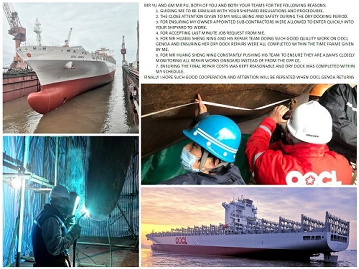 Cosco Shanghai Shipping Heavy Industry "OOCL Genoa" has sail ahead of schedule 31 December 2020 A few days ago, the "OOCL Genoa" completed the desulfurization conversion in COSCO SHIPPING Heavy Industry (Shanghai) Co., Ltd., and sail one day ahead of the original plan, which won the ship owner's praise ! As the company's first desulfurization conversion ship for The Orient Overseas Container Line (OOCL), the success of this project is crucial to the follow-up cooperation between the two sides. The company made a 15 days detailed repair plan, 7 days for dock repair. After the conversion conditions are well prepared, the work shall be completed 4 days ahead of the original plan, which built a foundation for the smooth docking works. The smooth sailing of the ship provided sufficient conditions for the owner to operate the next shipping. Therefore, the owner sent a thanks letter to the company. In the letter, the owner also expressed the wish of further cooperation with COSCO SHIPPING Heavy Industry (Shanghai) Co., Ltd.