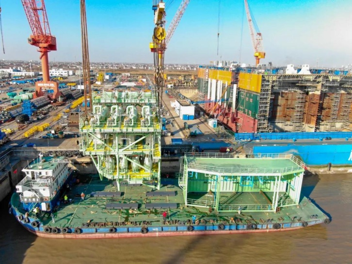 COSCO SHIPPING (Qidong) Offshore Co., Ltd. was successful delivered The M020 regasification module project 13 January 2021 10th January, The M020 regasification module project of COSCO SHIPPING (Qidong) Offshore Co., Ltd. have been successfully delivered. The regasification module is the core component of the FSRU (Floating LNG Storage and Gasification Unit). Its main function is to heat and vaporize -162℃ liquid LNG through a heat source for outward transport. The M020 regasification module project consists of four LNG regasification units with a total weight of 423 tons. In the current global epidemic is still severe environment, the smooth delivery of project is a great significance for the company to expand the further module market.