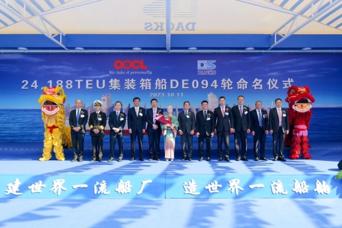30 October 2023 On 11th October, another 24,188 TEU container ship DE094 was named by DACKS. This is the sixth largest class container ship in the world independently researched and designed by the two Kawasakis and constructed by internal co-operation. This vessel is another powerful manifestation of CHI's response to the Group's request to implement "Intelligent + Shipping R&D and Application" and promote "Intelligent Shipping and Intelligent Manufacturing". This ship type integrates the latest scientific and technological achievements, is safe, reliable, energy-saving and environmentally friendly, and has a high degree of intelligence, which fully reflects the design capability and construction level of DACKS.