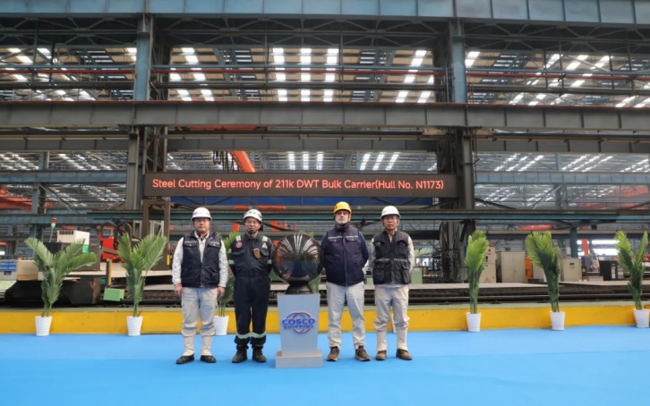 27 March 2025 On March 18, 2025, CHI (Yangzhou) reached another milestone as the steel cutting ceremony for the fourth vessel (Hull No. N1173) in the TMS Dry 211,000 DWT bulk carrier series commenced at its workshop. The event was attended by representatives from the shipowner, ABS surveyors, and relevant shipyard departments. As the fourth vessel in this series, N1173 inherits the advanced design concept from the lead ship N1169. Co-developed by CHI Design & Research Institute and MARIC, this Newcastlemax-class bulk carrier features fully independent intellectual property rights. The design incorporates multiple innovations including optimized hull lines and propeller matching, energy-saving devices, shaft generators, and large cargo hatch openings, achieving enhanced economic efficiency, propulsion performance, and environmental compliance. This steel cutting marks a new phase in the series' batch construction. Since the first vessel N1169 began construction in July 2024, CHI (Yangzhou) has maintained lean management practices and strengthened design-construction coordination. Through digital shipbuilding technologies and refined project management, the shipyard continues to advance the construction process, ensuring high-quality delivery of these greener and more efficient vessels for global shipping.