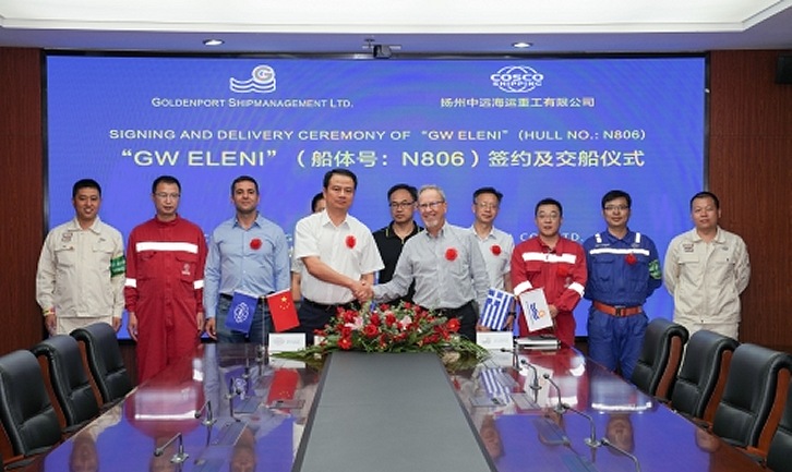 3 August 2020 On July 31, a 64,000DWT bulk carrier "GW ELENI" have been successful delivered to Greek owner Goldenport Shipmanagement Limited by COSCO SHIPPING Heavy Industry (Yangzhou) Co.,Ltd. As a key delivery project of the company in 2020, during the construction of "GW ELENI", the company overcame many difficulties, such as the members of the owner's supervision team, service providers and trial crew being unable to go to the factory due to the impact of the covid epidemic, and realized the resumption of work and production on schedule, so as to realize the smooth delivery of the ship. The smooth delivery of the "GW ELENI" has laid a solid foundation for the long-term strategic cooperation between COSCO SHIPPING Heavy Industry (Yangzhou) Co.,Ltd. and GOLDENPORT. As a mature ship type of the company, the 64,000DWT series bulk carrier has good economy and market reputation, and has established a good brand image of the company.