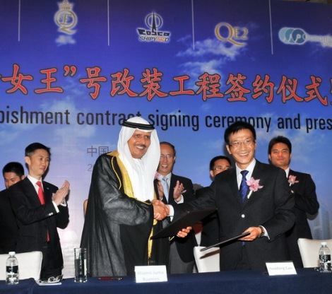 The Oceanic Group, COSCO Shipyard, Drydocks World and QE2 Holdings executives, as well as guests from the shipping, tourism and hotel operations industry attended the signing ceremony. The cruise ship, which hosted kings, queens, presidents, prime ministers and celebrities throughout its legendary 40-year history, will depart from Dubai and arrive in COSCO Shipyard¡'s facility in Zhoushan, Zhejiang Province. Once there, it will receive a thorough revitalization and makeover that is scheduled for completion by 2015. The existing 990 staterooms onboard the cruise ship will be converted into 400 premium all-suites ranging from 60 to 150 square metres. COSCO Shipyard will be responsible for all the technical repairs and coordinate with an appointed interior renovation contractor to revamp the accommodation and ballroom, as well as the refitting of seven restaurants, 10 lounges, a cinema, a maritime museum displaying QE2 memorabilia, and a shopping mall. In the near future, ¡°Queen Elizabeth 2¡± will become one of Asia¡¯s major waterfront tourist attractions, a new symbol of luxury, magnificence and appealing life. Mr. KhamisJuma Buamim, Chairman of QE2 Holdings and Dubai¡'s Drydocks World, said, "No other ship can match the QE2¡'s prestige, or her legacy. She is an absolute icon of maritime history, one of the best and most powerful ships in the world. Therefore, our decision on a partner was critical." Mr. Yan Chengxiang, Vice President of COSCO Shipyard, said, "The Zhoushan shipyard is one of COSCO¡¯s largest and newest, and it certainly has the capacity to host a cruise ship of the QE2¡'s stature. QE2 Holdings¡' decision to carry out this work with us is a reflection of COSCO Shipyard and COSCO Group¡'s leading position in China¡'s shipbuilding industry. We will appoint our best management, technology and production team to ensure first-rate service, smooth implementation and quality delivery of the project." COSCO Shipyard Group Co. Ltd. press release |