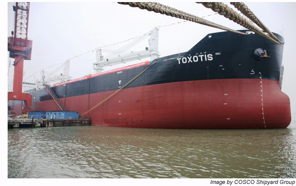 The naming ceremony for N226 was held in COSCO Guangdong Shipyard on 26th April. Godfather Mr. Panagiotis, named the vessel as "TOXOTIS" at the ceremony. Representatives from the shipowner, class, shipyard and ship crews witnessed the important moment together. So far, a total of five 57,000DWT bulk carriers have been constructed in COSCO Guangdong Shipyard, and the order for Dynacom is for five such vessels. Construction of the other four vessels is pushing forward on schedule.