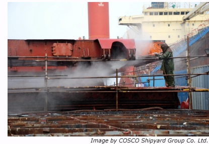 Recently, for the purposes of supporting the idea of environmental protection in ship repair propagated by the Green Expo, COSCO Shanghai Shipyard have adopted techniques for rust removal utilizing a high pressure water jet instead of traditional sand blasting. In terms of meeting the requirements of shipowners it worked very well and not only reduced the cost but also improved the air quality and production environment.