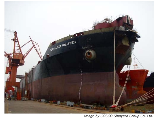 The series of 105K shuttle tankers are being built by COSCO Nantong Shipyard using its own design. Unlike a normal tanker, they are designed for oil transport from an offshore oil field, and equipped with dynamic positioning and an off-loading system.