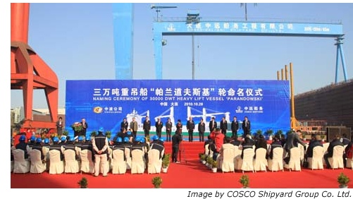 COSCO Dalian Shipyard held a naming ceremony for the newbuild 30K DWT Multi-Purpose Heavy Crane Vessel being delivered to the Chinese-Polish Joint Stock Shipping (CHIPOLBROK) on 28th October, 2010. At the naming ceremony, key representatives from the Polish Ministry of Infrastructure, the Polish Embassy in China, Chinese-Polish Joint Stock Shipping, the COSCO Shipyard Group, China Classification Society and Dalian Maritime Safety Administration, among others, celebrated the successful naming of the 30K DWT MPP HCV. This Multi-Purpose Heavy Lift Vessel was named "PARANDOWSKI" by Ms. Anna Wypych-Namiotko£¬ Undersecretary of State at the Polish Ministry of Infrastructure.