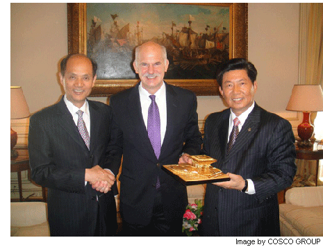 Prime Minister Papandreou also highly appreciated COSCO's efforts to promote the Port of Piraeus as a regional transshipment hub, saying that COSCO's deepening collaborations with its Greek partners will serve to the growing business ties between Greece and China.