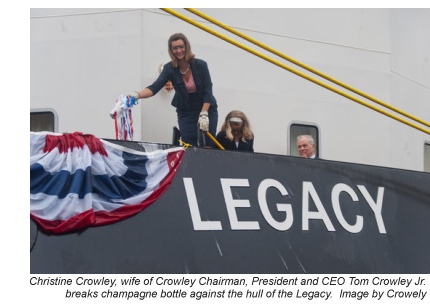Vessel sponsors Christine Crowley, wife of Tom Crowley, and Carole Shaffner, wife of Senior Vice President of Transportation and Logistics George Shaffner of Marathon Petroleum Corporation, performed the time-honored tradition of christening the vessels. More than 200 guests, including friends and employees from Crowley; the shipyards - VT Halter Marine, of Pascagoula, Miss., and Dakota Creek Industries, of Anacortes, Wash. - and vessel charterer, Marathon Petroleum, attended the event. A celebratory reception followed at the nearby Hilton Riverside. "We are thrilled to take delivery of this state-of-the-art ATB and to be able to put her to work for Marathon Petroleum," said Rob Grune, senior vice president and general manager, petroleum services. "Our customers today expect nothing less than best available technology, safety and cost effectiveness when it comes to the design and operation of innovative new vessels to meet their transportation requirements. Not only will these vessels be able to carry 330,000-barrels of product safely, but we also expect them to do so quickly - at speeds of 15-plus knots." The 750-1/Legacy is the first of three U.S. - flag 750 Class ATBs to be built for Crowley. Two more - the Legend/750-2 and Liberty/750-3 - are currently under construction and once completed, all three ATBs will be operated in the Jones Act U.S. coastwise trade by Crowley's petroleum services group. These three new vessels will bring Crowley's total ATB fleet to 17, including four 155,000-barrel and ten 185,000-barrel ATBs. The 750-1/Legacy will be operated by Crowley for Marathon Petroleum under a long-term charter arrangement. The 750-Class barges are 45,000 deadweight tons, 600 feet in length, 105-feet, six-inches in breadth and 54-feet, three-inches in depth. The fully loaded draft is 35 feet. The 750-1 was built by Halter Marine Inc. in Pascagoula, Miss., and the Legacy was constructed by Dakota Creek Industries, Inc. in Anacortes, Wash. The Legend/750-2 and Liberty/750-3 are scheduled for delivery between the second half of 2011 and the first half of 2013. Other vessels making up Crowley's industry-leading build program include the recently completed tenth and final 650 class ATB and four powerful ocean-class tugboats, currently under construction at Bollinger Shipyard in Amelia, La. Read more about all of Crowley's vessels at www.crowley.com. Jacksonville-based Crowley Holdings Inc., a holding company of the 119-year-old Crowley Maritime Corporation, is a privately held family and employee-owned company. The company provides project solutions, transportation and logistics services in domestic and international markets by means of six operating lines of business: Puerto Rico/Caribbean Liner Services, Latin America Liner Services, Logistics Services, Petroleum Services, Marine Services and Technical Services. Offered within these operating lines of business are: liner container shipping, logistics, contract towing and transportation; ship assist and escort; energy support; salvage and emergency response through its TITAN Salvage subsidiary; vessel management; vessel construction and naval architecture through its Jensen Maritime subsidiary; government services, and petroleum and chemical transportation, distribution and sales. Additional information about Crowley, its subsidiaries and business units may be found on the Internet at www.crowley.com. Crowely press release |