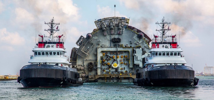Relocation to deeper waters marked the beginning of the second phase of work, the offshore stage. Here, the Ocean Wind and Ocean Wave maintained their positions and towed the Lucius to its final location. In the final stage, the positioning phase, the Ocean Wind, Ocean Wave and Ocean Sun helped hold the platform in its final location, and remained on site in a star pattern to provide support as the spar was connected to its moorings and made storm safe in 7,100 feet of water. The project continued with transport of the rig’s sub cellar deck, which is the lower of the two decks of the spar topside structure. This was transported aboard Crowley’s Marty J, the first of Crowley’s eight 400-foot by 105-foot-wide high-deck strength barges and towed by the Ocean Sun. Conclusion of the project will come as one of the ocean class tugboats tows Lucius’ 9000-ton topside module atop Crowley’s 400 foot by 130-foot wide, high-deck strength barge Julie B from Corpus Christie, Texas, along the same 300 mile route as its preceding parts. “This was another successful pairing of Crowley’s new ocean class tugboats and high-deck strength barges,” said Crowley’s John Ara, vice president, solutions. “With each project, our crews and customers gain a better understanding of the full potential of our new equipment. As a result, we’re now being awarded an increased scope of work with more intricate involvement in these major installations.” Crowley’s ocean class tugs are modern ocean towing twin-screw vessels with controllable pitch propellers (CPP) in nozzles, high-lift rudders and more than 147 MT bollard pull. The first two ocean class vessels, the Ocean Wave and Ocean Wind, are classed as Dynamic Positioning 1 (DP1) tugboats and are twin-screw, tugs with an overall length of 146 ft., beam of 46 ft., hull depth of 25 ft. and design draft of 21 ft. The second two tugs of the class, Ocean Sky and Ocean Sun, are classed as DP2 and are 10 feet longer. All four vessels are capable of rig moves, platform and Floating Production, Storage and Offloading (FPSO) unit tows, emergency response, salvage support and firefighting. “Just as they did during the recent Olympus tow, these specialized tugboats are proving themselves as workhorses for our valued upstream energy customers and for companies and government entities needing long-range, high-capacity, ocean towing along with salvage and emergency response support,” said Crowley’s Todd Busch, senior vice president and general manager, technical services. “They continue to solidify our standing as an industry leader in ocean towing, salvage and offshore marine support.” Beginning in 2014, Lucius will produce oil and gas through a truss spar floating production facility. It will have a nameplate capacity of 80,000 barrels of oil a day (BOPD) and 450 million cubic feet of gas a day (mcf/d). Jacksonville-based Crowley Holdings Inc., a holding company of the 121-year-old Crowley Maritime Corporation, is a privately held family and employee-owned company. The company provides project solutions, transportation and logistics services in domestic and international markets by means of six operating lines of business: Puerto Rico/Caribbean Liner Services, Latin America Liner Services, Logistics Services, Petroleum Services, Marine Services and Technical Services. Offered within these operating lines of business are: liner container shipping, logistics, contract towing and transportation; ship assist and escort; energy support; salvage and emergency response through its TITAN Salvage subsidiary; vessel management; vessel construction and naval architecture through its Jensen Maritime subsidiary; government services, and petroleum and chemical transportation, distribution and sales. Additional information about Crowley, its subsidiaries and business units may be found on the Internet at www.crowley.com. Crowely press release |