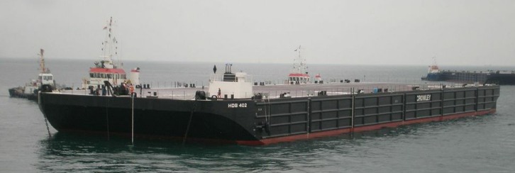 September 29, 2014 Crowley Maritime Corporation’s solutions group announced today that it has received the first two of potentially four, new heavy-lift, ballastable deck barges (HDBs) for use by clients in the Asia-Pacific region. These new barges, which will be contracted and managed from the company’s recently opened Singapore office, allow Crowley to better support regional customers in the oil and gas mining; Engineering, Construction and Procurement Management (ECPM); and Engineering, Procurement, Installation and Commissioning (EPIC) industries who are increasingly embarking on large-scale onshore and offshore projects. These new 400-foot-long, 120-foot-wide (122 meter x 36.5 meter) HDBs, named HDB 01 and HDB 02 are moored in Batam, Indonesia. They have 25-foot (7.6-meter) side shells, which provide both the capacity and deck strength (up to 4,200 pounds per square foot or 25 tons per square meter) needed to accommodate larger drilling and production units used for deepwater offshore energy exploration and development. They are designed with more robust ballast systems to deal with high tidal ranges found in the region’s load and discharge ports and have higher internal strength which allows tolerance when ballasting to the seabed, fully loaded – where tidal movement can be problematic.