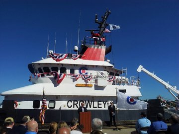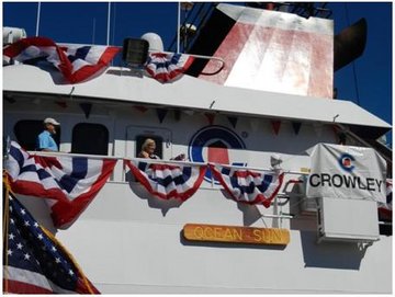 Lake Charles - October 15, 2014 As part of the company's industry-leading new vessel build program, Crowley Maritime Corp. christened the latest of its four tugboats in the ocean class series, Ocean Sun, today in Lake Charles. The ceremony served to formally welcome the fourth dynamic positioning 2 (DP2) tugboat to the company’s expanded ocean towing fleet, which has been involved in most of the major offshore oil production installations in the U.S. Gulf of Mexico over the past 18 months. Todd Busch, senior vice president and general manager of Crowley’s solutions group, opened the ceremony to approximately 80 guests. He was followed by a series of speakers including Tom Crowley, chairman and CEO; Craig Tornga, vice president, solutions, and Robert Socha, executive vice president, sales and marketing, Bollinger. Following an introduction of the tug’s crew members by Cal Hayden, vice president, marine operations for Crowley, and a blessing of the vessel by Deacon Patrick Lapoint, director of the Stella Maris Seafarers' Center at the Port of Lake Charles, Vessel Sponsor Coreen Busch, wife of Todd Busch, broke the ceremonial bottle of champagne across the hull of the boat. ENI Petroleum, Heerema and Bechtel – all Crowley customers – had representatives in attendance, as did the area’s port commission. “Today we are pleased to formally welcome the latest of our four Jones Act ocean class tugboats to the fleet and culminate this multi-year build program,” said Crowley. “These boats, along with their exceptional crews, have consistently met and exceeded the expectations of our energy customers doing business in the U.S. Gulf of Mexico. We look forward to many years of service from these powerful and reliable cornerstone vessels.” The Ocean Sun, which features DP2 technology, is part of a feature-rich, four-vessel family of tugs ideally suited to work with Crowley's new 455 series high-deck strength barges, which measure 400 feet long by 105 feet wide (121.92 meters by 32 meters). Crowley’s ocean class tugs are outfitted for long-range, high-capacity ocean towing, rig moves, platform and floating production, storage and offloading (FPSO) unit tows, emergency response and firefighting. All four of the ocean class tugboats are designed to have a minimum bollard pull of 150 metric tons and a range of approximately 12,600 nautical miles at 15 knots free running. They are outfitted with twin-screw, controllable-pitch propellers in nozzles and high lift rudders for a combination of performance and fuel economy. During the first-ever pairing of all four ocean class tugs – Ocean Wave, Ocean Wind, Ocean Sky and Ocean Sun – worked together to tow the largest offshore oil production and drilling platform of its kind ever to be built for use in the U.S. Gulf of Mexico, the 120,000 ton TLP Olympus for 425-miles from Ingleside, Texas, to her final location in more than 3,000 feet of water. Later the quad towed, moored and made storm-safe the Jack/St. Malo topside at a depth of 7,000 feet and moved Delta House floating production platform and Chevron’s TLP Bigfoot. Three of the tugs, Ocean Wave, Ocean Wind and Ocean Sun, also towed the 605-foot long, 110-foot wide Lucius spar for Anadarko Petroleum from Corpus Christi, Texas, to Keathley Canyon Block 875 some 300 miles offshore; and Ocean Wind towed the production deck of Saipem’s Tubular Bells topside also in the Gulf of Mexico. Crowley's solutions group is a Project Management Organization (PMOrg) providing marine solutions as a prime contractor for the energy and resource extraction industries. This specialized team, which has its main Project Management Office (PMO) in Houston, Texas, provides turnkey marine solutions through the company's diverse capabilities, assets and world-class project management skills. The solutions group allows Crowley to provide greater value to customers with multifaceted marine and offshore construction-related projects. Additional information about this group can be found online at www.crowley.com/solutions. Additional information about parent company, Crowley – a marine solutions, energy and logistics services company founded in 1892 – can be found at www.crowley.com. Crowely press release |