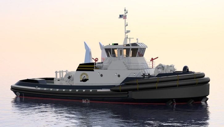 The multipurpose tractor tug, which is being built by JT Marine of Vancouver, Wash., was jointly developed by Vessel Chartering LLC and Jensen. The 110-foot long vessel will feature the ship assist and escort capabilities of smaller harbor tugs, while delivering the improved towing performance and increased range of larger ocean-going tugs. The escort capability was enhanced to provide support for assisting large, 18,000 TEU containerships due to an increased future demand in West Coast ports of call. The design offers the flexibility to support ship escorts, assists and towing. The engines are designed to meet the federal Tier IV standard, which incorporate the emissions-reducing performance requirements by the U.S. Environmental Protection Agency (EPA). To meet the requirements, the two engines on this vessel use systems that clean exhaust gases after they have left the engines. This is the third tugboat designed by Jensen Maritime with engines meeting the Tier IV requirement. With new ballast water treatment requirements on the horizon from the EPA and U.S. Coast Guard, the tug was designed without any ballast tanks, thereby eliminating the need for ballast water discharge and the potential transfer of invasive species. In lieu of ballast tanks, the tug will transfer fuel, as necessary, in order to maintain proper trim. “The development of the Tier IV engines for this tug demonstrates our commitment to innovative, environmentally friendly design while continuing to deliver powerful, high-quality performance,” said Johan Sperling, vice president, Jensen Maritime. “This tug will meet our industry’s demands for strong, yet nimble vessels with the quality design people expect from us.” The tug is planned for delivery in the second quarter of 2017 to Vessel Chartering LLC., a wholly owned division of Baydelta Navigation Ltd. The vessel, which will be 40-feet wide, will be powered by a pair of 3,385-horsepower Caterpillar 3516 Tier IV engines. With an electrically powered, double drum tow winch aft by Rapp USA and an electrically powered hawser winch forward by Markey Machinery as deck machinery, the vessel will be capable of a 93-to-95 short-ton bollard pull. Both winches’ electrical power will remove any chance of a hydraulic oil spill on deck.