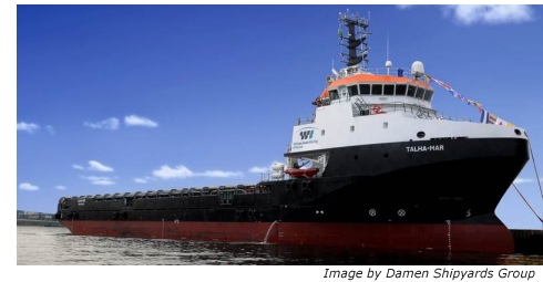 Wilson, Sons is the largest operator of harbour tugs in Brazil and already has a large fleet of Damen vessels comprising Azimuth Stern Drive (ASD) tugs and Platform Supply Vessels (PSV). Main characteristics The 4500 DWT vessel has a LOA of 87 m, 16 m beam and maximum draught of 6.19 m, providing a large deck area amounting to 840 m². A diesel electric propulsion system comprising four Caterpillar 3512C generator sets, each of 1,570 ekWat 1,800 rpm, power two Rolls-Royce azimuth thrusters of 2,500 kW. Fixed pitch propellers of 2,800 mm diameter, with nozzle, deliver a speed of 13 knots (at 5 m draught). A Caterpillar C9 genset of 238 ekW at 1,800 rpm is for emergency use. Twin bow thrusters ensure good manoeuvrability and the vessel has a dynamic positioning DP2 classification. There is accommodation for 14 crew and up to six passengers. New range Currently Damen is engaged in the design of a new range of PSVs. Based on operational studies, feedback and questionnaires from crew and operators of the Damen PSV 3000, 4500 and other non-Damen PSVs operating in the area, analyses are made to refine the specifications of the new design. The new Damen PSV range will soon cover five models, the 3300 (the number relates to the vessels’ deadweight), the smaller 1600 and 2500 and the larger 4000 and 5000, which are currently being designed.Together with Wilson, Sons Damen is developing several other vessel types for the Brazilian offshore market, such as Anchor Handlers, ROV Support Vessels and Well-stimulation Vessels. Damen Shipyards Group press release |
