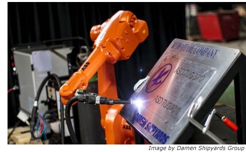At the festive launching ceremony Damen was very pleased to host a delegation of Kuwait Oil Company. The two company-logos were welded together as a palpable symbol for the substantial project and the companies’ longstanding relation. The object will hold a place of honour in Damen’s Romania-based Galati shipyard during the construction period. All 14 units will be build there starting shortly, with deliveries scheduled from 2014 onwards.