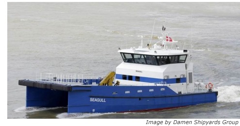 Chiel de Leeuw, Damen Sales Manager Scandinavia, comments: “Because we build these vessels for stock Damen is able to supply customers quickly and on top of this we were able to offer Sea Consult attractive financial options from Damen Customer Financing.” The vessel was built at Damen Shipyards Singapore, which is a Group specialist in high-speed aluminium craft. “Damen is very much looking forward to seeing Sea Consult’s business grow in this exciting market and hopes that the two companies can develop a long-lasting fruitful cooperation,” says Mr de Leeuw. About the Twin Axe Fast Crew Supplier (FCS) 2610: The FCS 2610 design enables the safe transfer of personnel onto platforms or wind turbines at wave heights of more than 2.5 metres. Other distinctions are the maximum speed of 26 knots (with a range of 1,200 nm, depending on sea state) and the low fuel consumption, another result of the low-resistance double Sea Axe bow. The 26 x 10 m vessel offers accommodation for a crew of four and up to 12 passengers. With ample working and storage space on deck it is possible to load various types of cargo with the onboard crane (20 tm), incl. either two 10” containers or two 20” containers. Furhtermore, the vessel shows a spacious rescue platform, HP cleaning unit, a three-point mooring system and extra mooring winches. 20 stock vessels In order to serve growing demand for this type of Offshore Wind high-speed support vessel (of which Damen has sold 19 in two years’ time), some 20 vessels are currently being built for stock. Part of this stock can be outfitted and finished according to customer demands. Because of its standardisation and stock-building philosophy, Damen offers very short delivery times. Smaller version built for stock Four FCS 2008, the smaller sister of the 2610, are also under construction at Damen Shipyards Den Helder (the Netherlands) History Introduced to the market in June 2011, the Damen Twin Axe Fast Crew Supplier 2610 has already established itself as “The Industry Standard” for the offshore wind market. However, the vessel is suitable in multiple roles and provides a very stable platform for diving, surveying and support, being able to carry two 20ft containers and it can work with jack-up platforms. The type can be used to deliver cargo to platforms and carry out crew transfers to and from the platform via man baskets, due to its large deck space forward. Damen Shipyards Group press release |